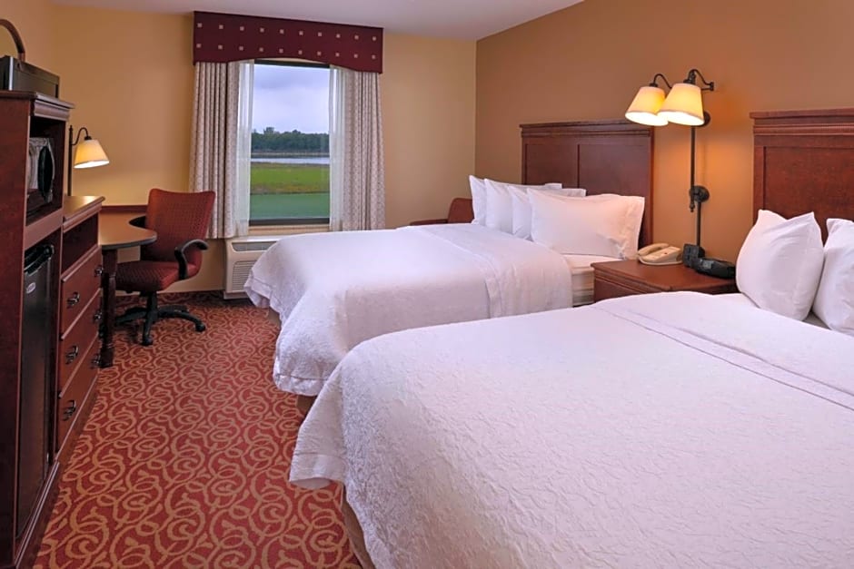32-inch TV with premium HD selections, WiFi, 1-cup coffeemaker, large workspace Relax in this spacious and comfortable non-smoking guest room. The two queen-sized Sweet Dreams® by Serta beds will whisk you off to a peaceful night's rest. The room features a 32-inch LCD TV with premium HD selections, ultra-fast WiFi access and plenty of work space to stay connected to the office. For your convenience the room also has a refrigerator, microwave, 1-cup coffeemaker, convenient bedside charging station and new Hampton easy set cube alarm clock. Select guest rooms can be connected by an interior door.